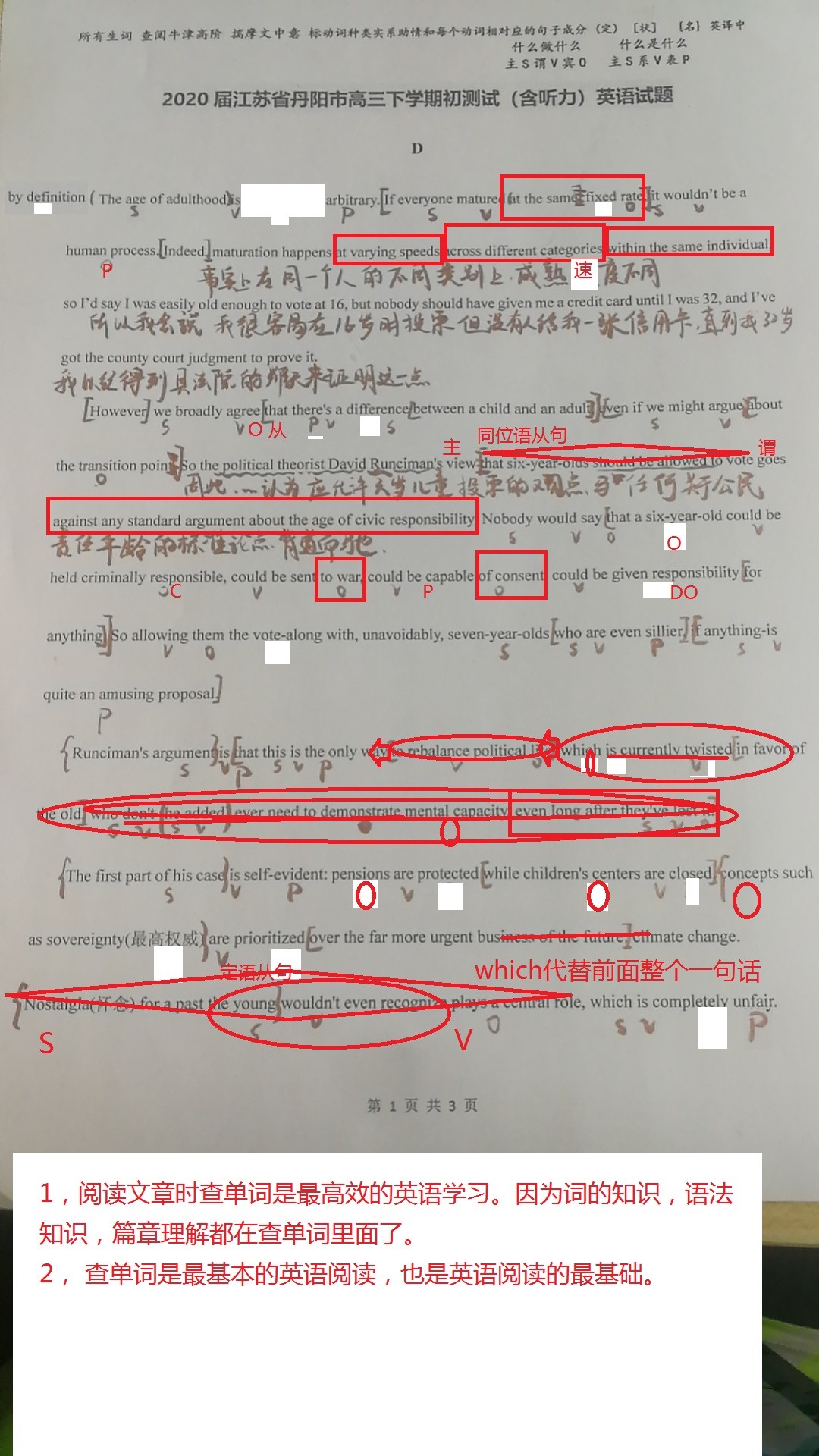 学校学案或者布置的作业中的,完形填空,阅读理解,任务型阅读,语法填空,凡是文章不能透彻理解的,都要认真地查生词,划句子成分,翻译,三管齐下,彻底理解文章。